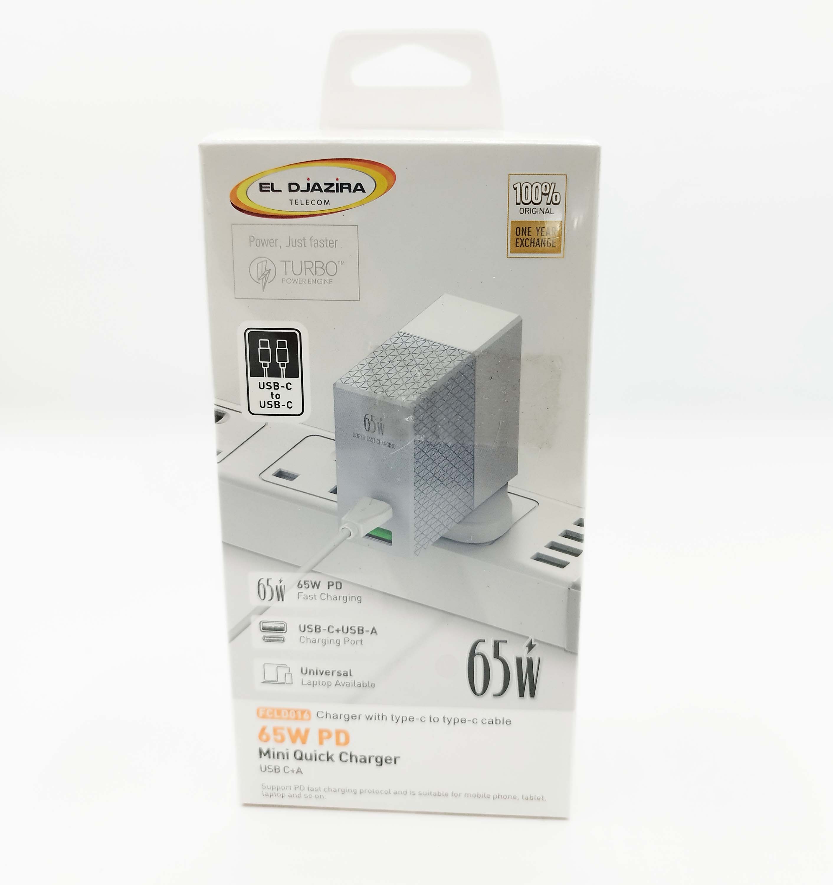 Le chargeur rapide mini 65W PD d'El Djazira Telecom est conçu pour offrir une charge rapide et efficace pour une variété d'appareils, y compris les ordinateurs portables. Il utilise la technologie TURBO™ Power Engine pour garantir une puissance de charge optimale. Voici ses principales caractéristiques :
